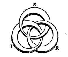 (49) Tudo isso desembocou em algo que se pode desenhar empregando várias cores diferentes. Acreditei poder ligar o simbólico (este aqui, o arbitrário), o real e o imaginário.